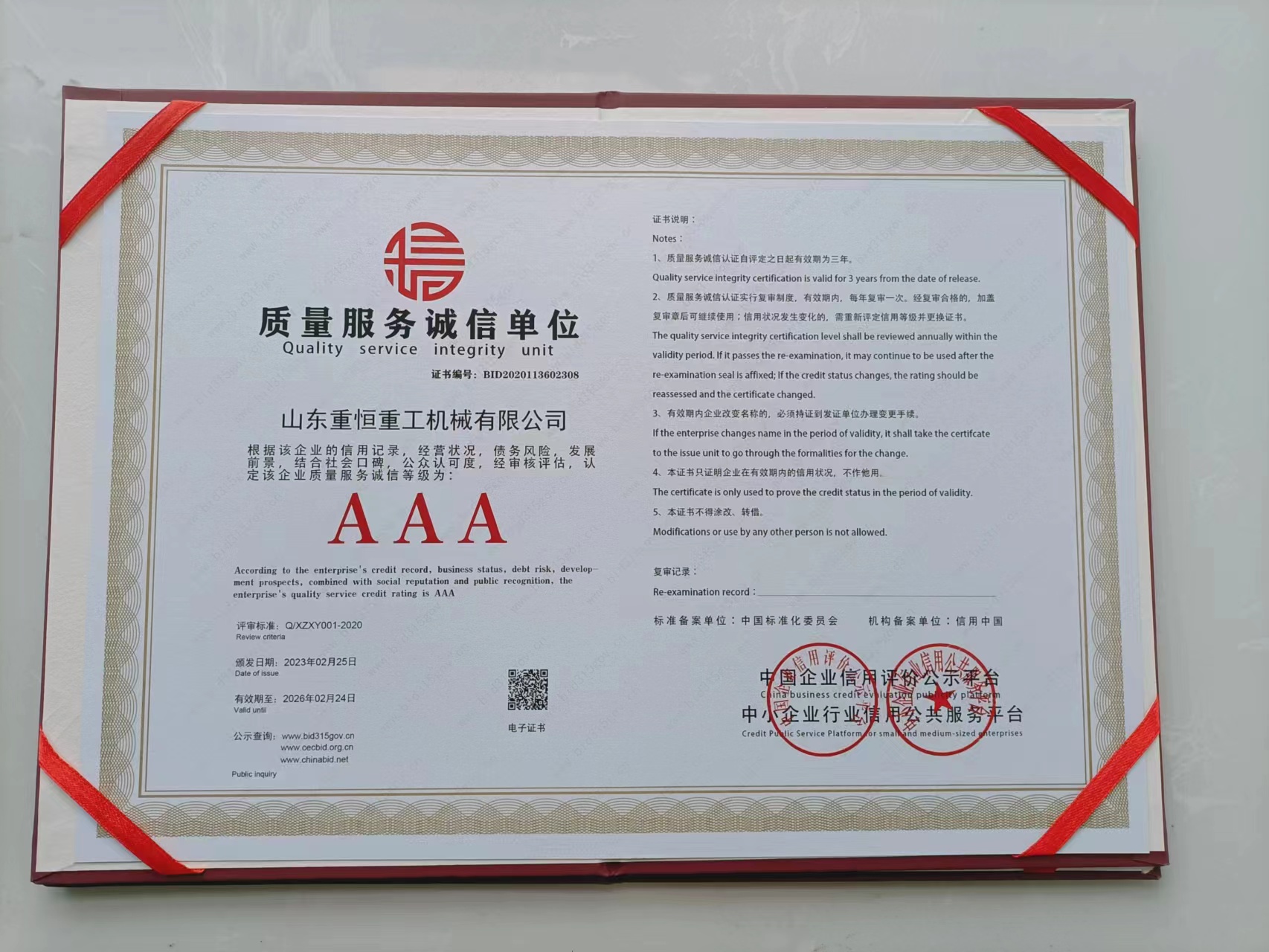 山東重恒重工機械有限公司成立于2011年6月,在其經(jīng)營期間榮獲給類專業(yè)榮譽證書和認證資質(zhì),是國家3A級誠信經(jīng)營示范單位、質(zhì)量服務(wù)誠信單位、重合同守信用企業(yè)、3A級企業(yè)信用等級證書、國家質(zhì)量管理體系認證證書、ISO9001等各類專業(yè)資質(zhì),公司在研發(fā)過程中,注重技術(shù)創(chuàng)新和級,通過不斷提高產(chǎn)品的品質(zhì)和性能,使產(chǎn)品能夠更好地適應(yīng)市場需求,同時憑借專業(yè)的售后服務(wù)團隊,能夠及時為客戶提供售后服務(wù)和維修保養(yǎng)服務(wù),讓客戶朋友用先進的設(shè)備享受優(yōu)質(zhì)的體系服務(wù)。